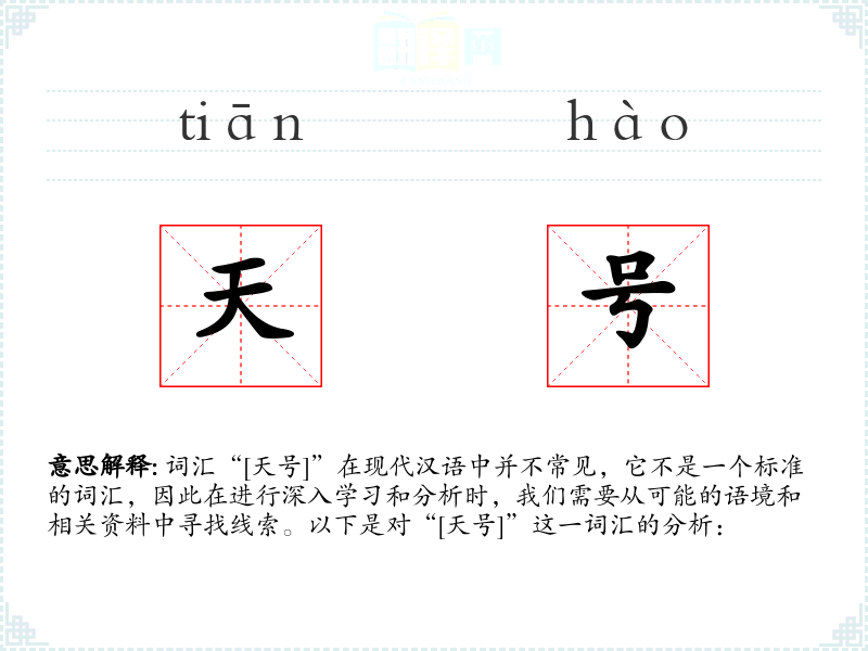 由于“[天号]”不是一个标准词汇,我们无法给出一个确切的字面意思和基本含义。它可能是某个特定领域或方言中的词汇,或者是某个特定文献中的用语。