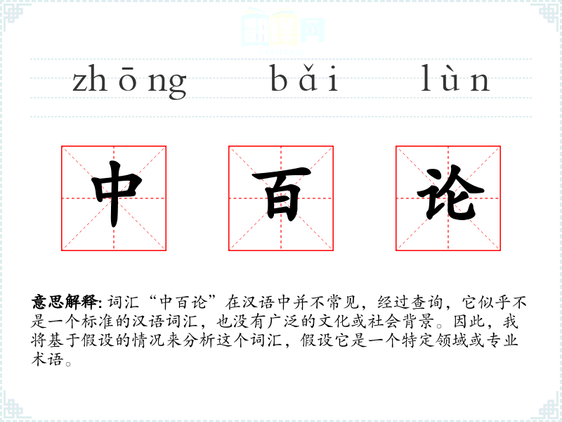 假设“中百论”是一个专业术语,可能指的是某种理论或论述,其中“中”可能表示中间、中心或中立,“百”可能表示全面、广泛或数量,“论”则表示理论或论述。因此,“中百论”可能指的是一种全面、中立的理论或论述。