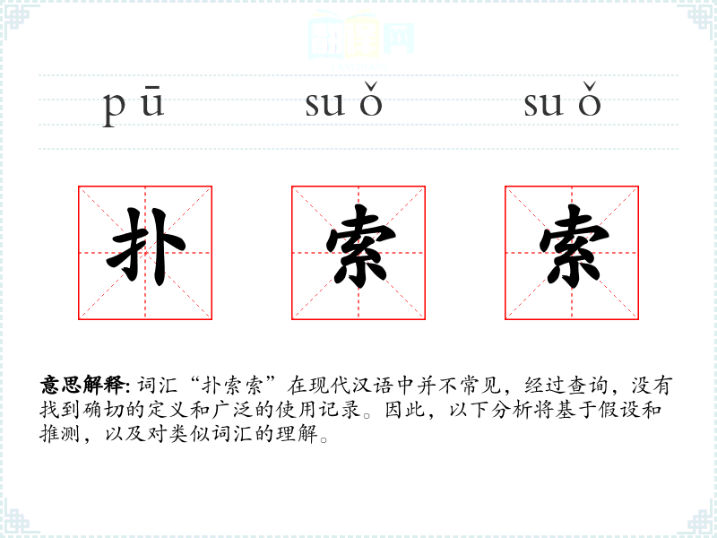 由于“扑索索”不是一个标准词汇,我们无法提供确切的字面意思和基本含义。如果假设它是一个拟声词,可能是用来描述某种快速、连续的动作或声音,类似于“扑通扑通”或“索索”。