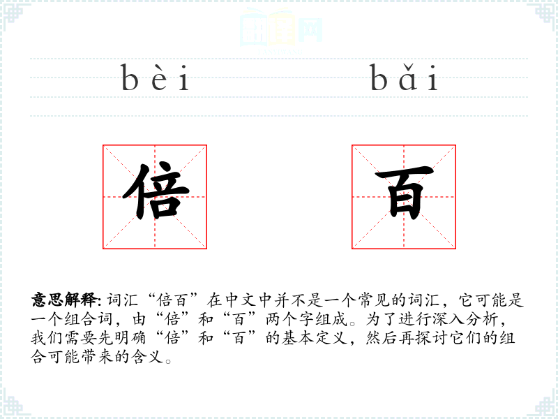 由于“倍百”不是一个常用词汇,我们无法直接分析其在不同语境下的使用。但是,我们可以推测,如果“倍百”作为一个词汇存在,它可能表示数量增加到一百倍的意思。