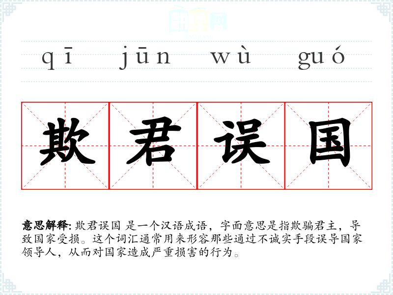 欺君误国 是一个汉语成语,字面意思是指欺骗君主,导致国家受损。这个词汇通常用来形容那些通过不诚实手段误导国家领导人,从而对国家造成严重损害的行为。