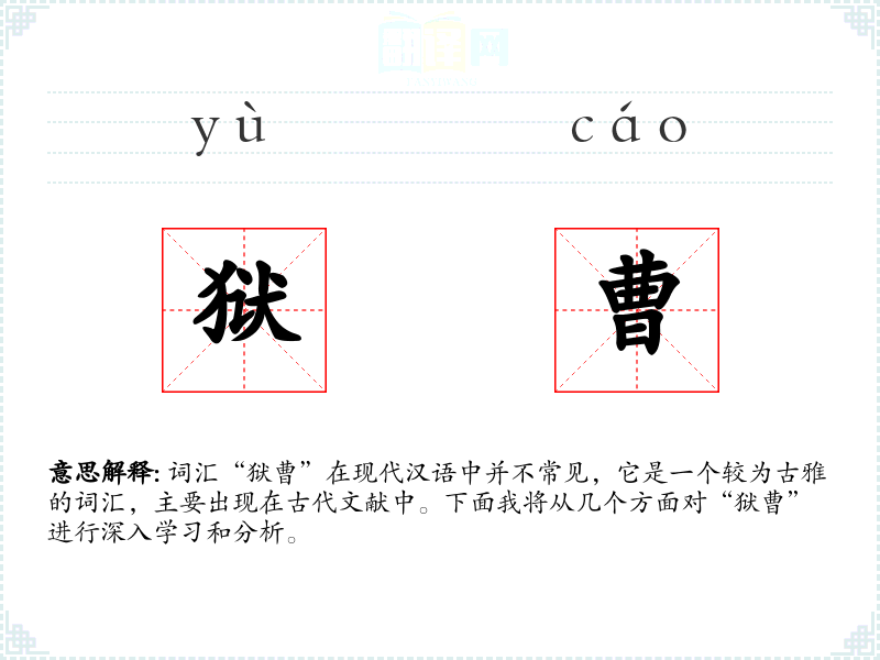 词汇“狱曹”在现代汉语中并不常见,它是一个较为古雅的词汇,主要出现在古代文献中。下面我将从几个方面对“狱曹”进行深入学*和分析。