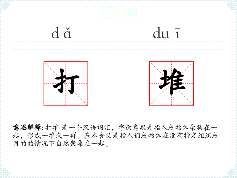 在英语中,“打堆”可以对应为“gather in a crowd”或“cluster together”,虽然表达方式不同,但基本含义相似。
