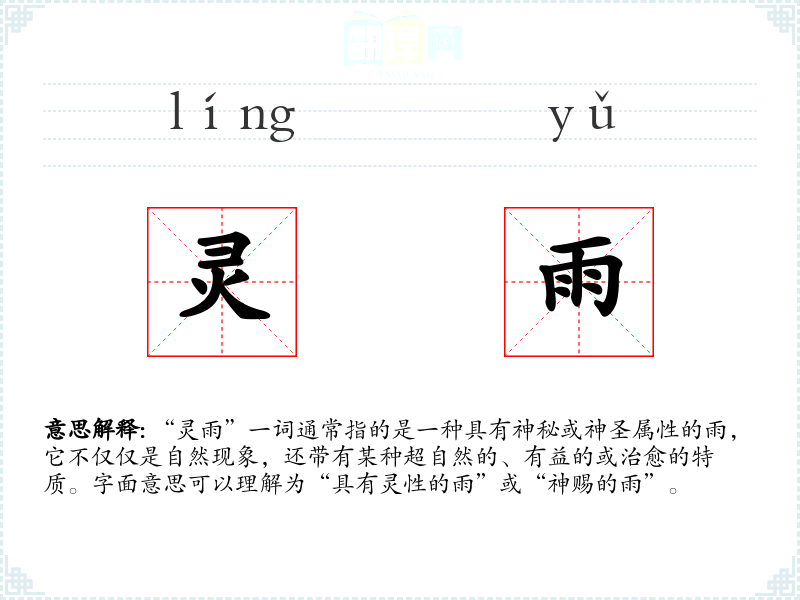 “灵雨”一词通常指的是一种具有神秘或神圣属性的雨,它不仅仅是自然现象,还带有某种超自然的、有益的或治愈的特质。字面意思可以理解为“具有灵性的雨”或“神赐的雨”。