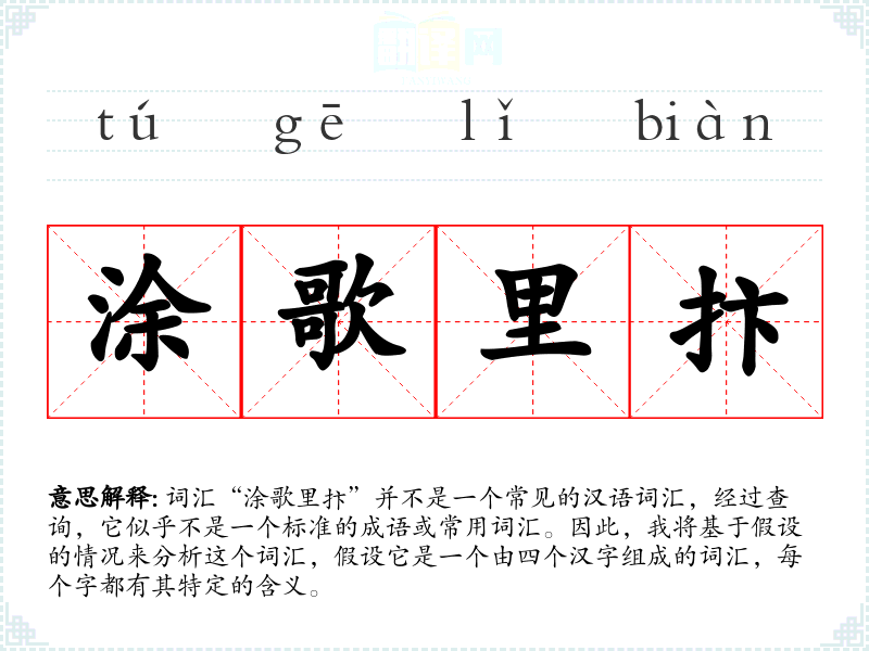 词汇“涂歌里抃”并不是一个常见的汉语词汇,经过查询,它似乎不是一个标准的成语或常用词汇。因此,我将基于假设的情况来分析这个词汇,假设它是一个由四个汉字组成的词汇,每个字都有其特定的含义。