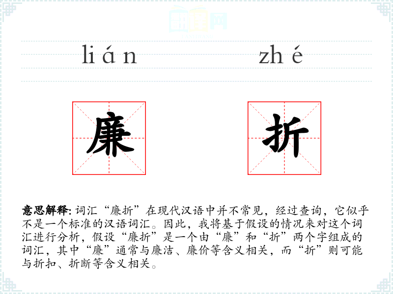 词汇“廉折”在现代汉语中并不常见,经过查询,它似乎不是一个标准的汉语词汇。因此,我将基于假设的情况来对这个词汇进行分析,假设“廉折”是一个由“廉”和“折”两个字组成的词汇,其中“廉”通常与廉洁、廉价等含义相关,而“折”则可能与折扣、折断等含义相关。