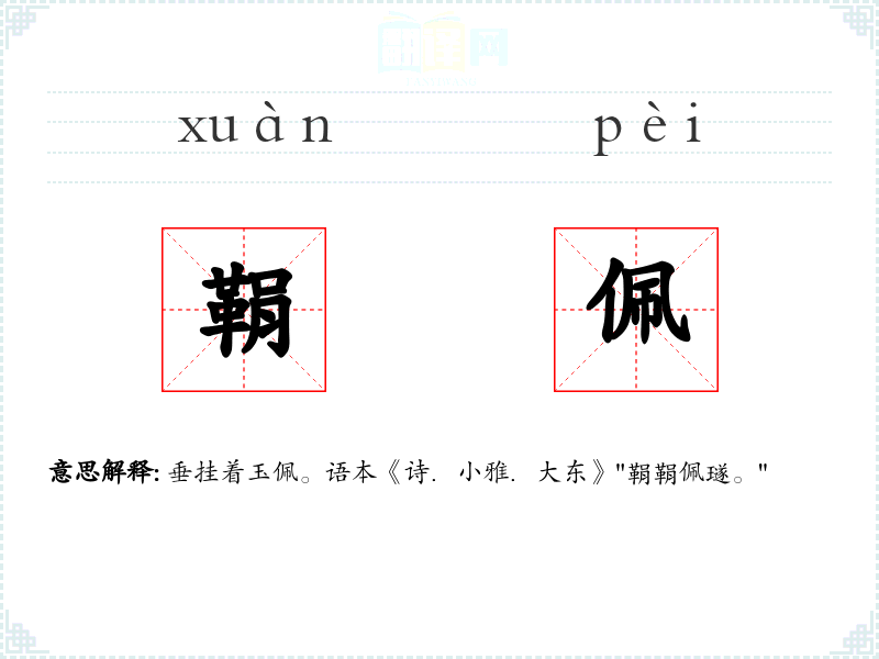 垂挂着玉佩。语本《诗.小雅.大东》"鞙鞙佩璲。"
