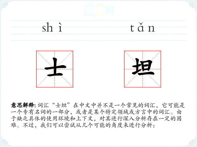 如果“士坦”是一个外来词汇的一部分,它可能源自某种外语,如英语中的“stan”可能来源于“stand”的变体,意为“站立”。
