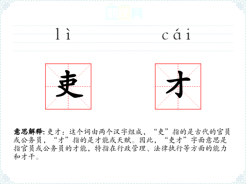 吏才:这个词由两个汉字组成,“吏”指的是古代的官员或公务员,“才”指的是才能或天赋。因此,“吏才”字面意思是指官员或公务员的才能,特指在行政管理、法律执行等方面的能力和才干。