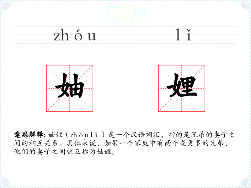 妯娌(zhóu lǐ)是一个汉语词汇,指的是兄弟的妻子之间的相互关系。具体来说,如果一个家庭中有两个或更多的兄弟,他们的妻子之间就互称为妯娌。