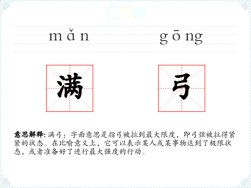 - 口语:在日常对话中,可能会用“满弓”来形容某人准备全力以赴,如“他已经满弓待发,准备参加比赛”。