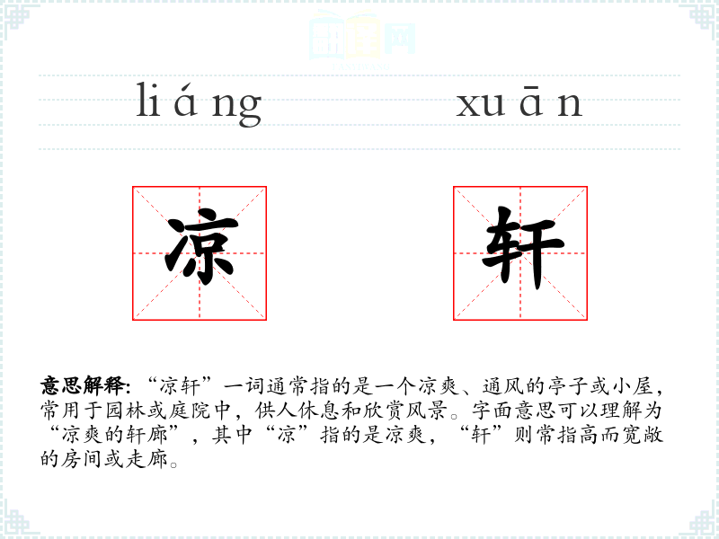 “凉轩”一词通常指的是一个凉爽、通风的亭子或小屋,常用于园林或庭院中,供人休息和欣赏风景。字面意思可以理解为“凉爽的轩廊”,其中“凉”指的是凉爽,“轩”则常指高而宽敞的房间或走廊。