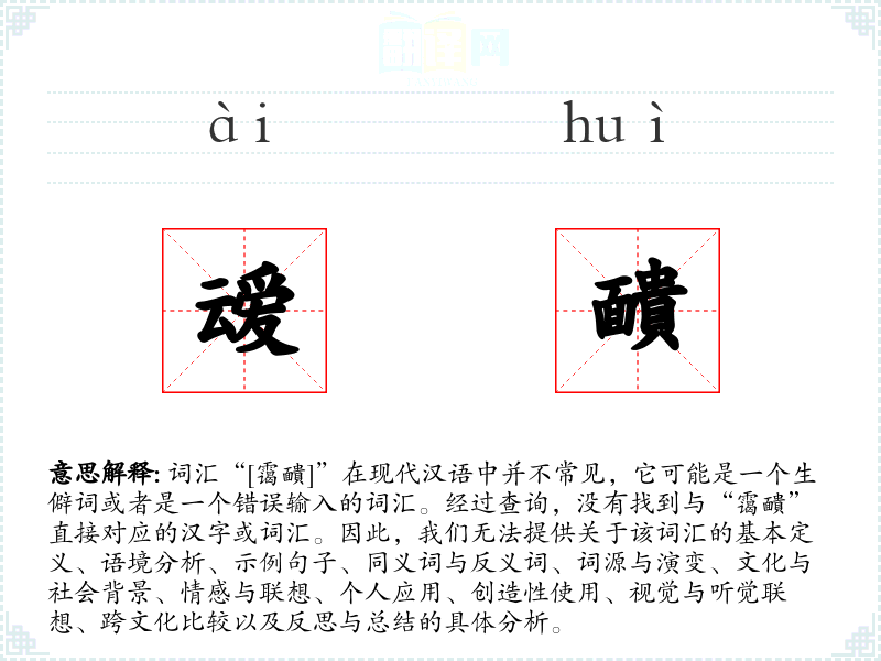 词汇“[霭靧]”在现代汉语中并不常见,它可能是一个生僻词或者是一个错误输入的词汇。经过查询,没有找到与“霭靧”直接对应的汉字或词汇。因此,我们无法提供关于该词汇的基本定义、语境分析、示例句子、同义词与反义词、词源与演变、文化与社会背景、情感与联想、个人应用、创造性使用、视觉与听觉联想、跨文化比较以及反思与总结的具体分析。