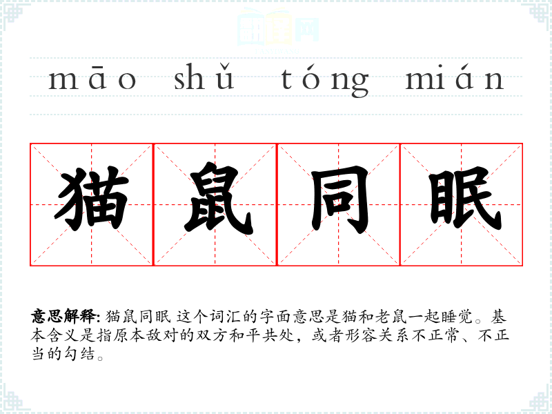 猫鼠同眠 这个词汇的字面意思是猫和老鼠一起睡觉。基本含义是指原本敌对的双方和平共处,或者形容关系不正常、不正当的勾结。