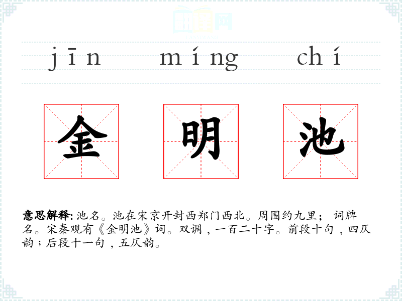 池名。池在宋京开封西郑门西北。周围约九里; 词牌名。宋秦观有《金明池》词。双调﹐一百二十字。前段十句﹐四仄韵﹔后段十一句﹐五仄韵。