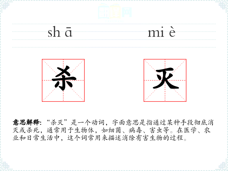 “杀灭”由“杀”和“灭”两个字组成,“杀”字古已有之,意为杀死;“灭”字意为消失、毁灭。两者结合,强调了彻底性和终结性。