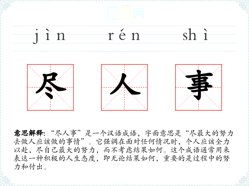 “尽人事”是一个汉语成语,字面意思是“尽最大的努力去做人应该做的事情”。它强调在面对任何情况时,个人应该全力以赴,尽自己最大的努力,而不考虑结果如何。这个成语通常用来表达一种积极的人生态度,即无论结果如何,重要的是过程中的努力和付出。