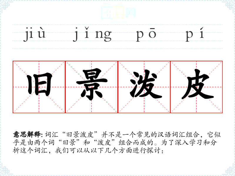 词汇“旧景泼皮”并不是一个常见的汉语词汇组合,它似乎是由两个词“旧景”和“泼皮”组合而成的。为了深入学*和分析这个词汇,我们可以从以下几个方面进行探讨: