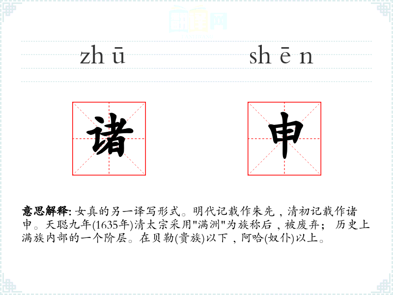 女真的另一译写形式。明代记载作朱先﹐清初记载作诸申。天聪九年(1635年)清太宗采用"满洲"为族称后﹐被废弃; 历史上满族内部的一个阶层。在贝勒(贵族)以下﹐阿哈(奴仆)以上。