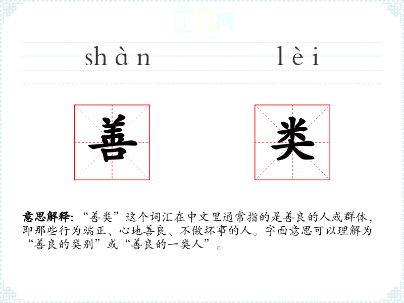 “善类”这个词汇在中文里通常指的是善良的人或群体,即那些行为端正、心地善良、不做坏事的人。字面意思可以理解为“善良的类别”或“善良的一类人”。
