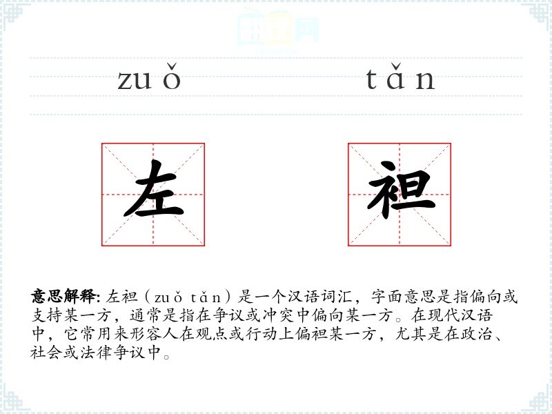 左袒(zuǒ tǎn)是一个汉语词汇,字面意思是指偏向或支持某一方,通常是指在争议或冲突中偏向某一方。在现代汉语中,它常用来形容人在观点或行动上偏袒某一方,尤其是在政治、社会或法律争议中。