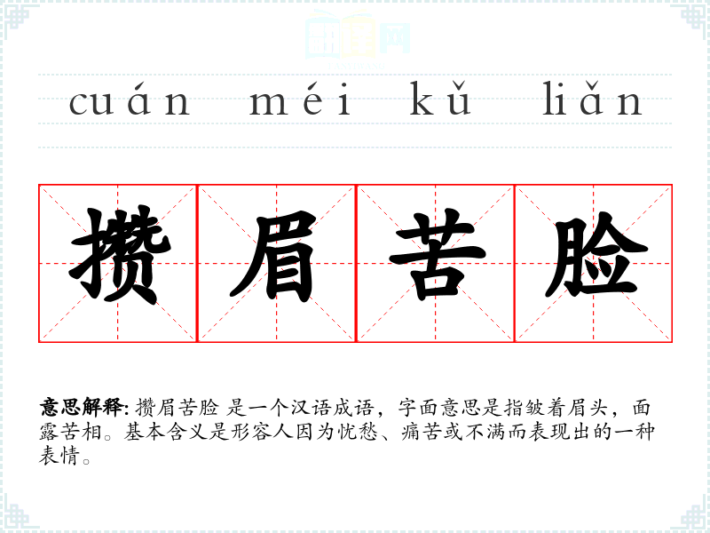 攒眉苦脸 是一个汉语成语,字面意思是指皱着眉头,面露苦相。基本含义是形容人因为忧愁、痛苦或不满而表现出的一种表情。