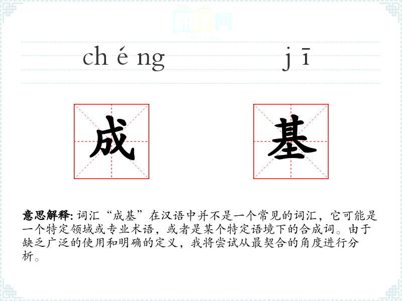 词汇“成基”在汉语中并不是一个常见的词汇,它可能是一个特定领域或专业术语,或者是某个特定语境下的合成词。由于缺乏广泛的使用和明确的定义,我将尝试从最契合的角度进行分析。