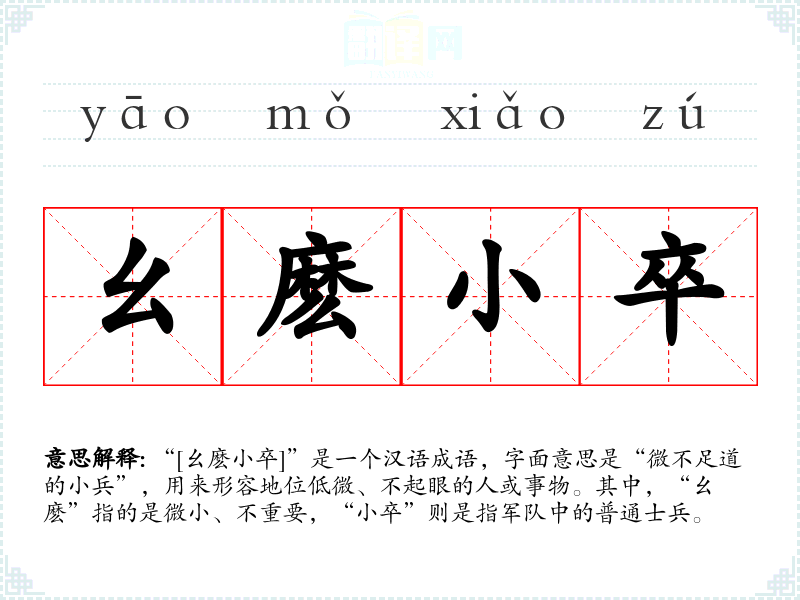 “[幺麽小卒]”是一个汉语成语,字面意思是“微不足道的小兵”,用来形容地位低微、不起眼的人或事物。其中,“幺麽”指的是微小、不重要,“小卒”则是指军队中的普通士兵。