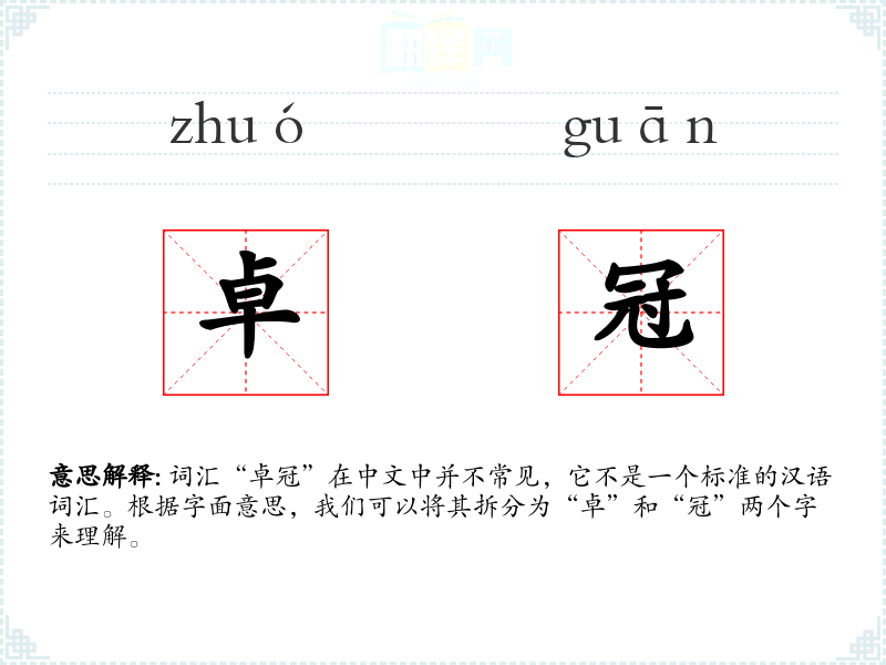 词汇“卓冠”在中文中并不常见,它不是一个标准的汉语词汇。根据字面意思,我们可以将其拆分为“卓”和“冠”两个字来理解。