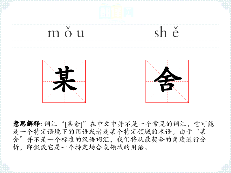 “某舍”字面意思可能是指某个特定的住所或场所,其中“某”表示不确定的或特定的某一个,“舍”通常指住所或小屋。