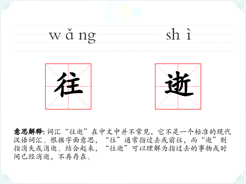 - 文学:在文学作品中,“往逝”可能用来形容历史的变迁或人物的逝去,带有一定的哀愁和怀旧情感。