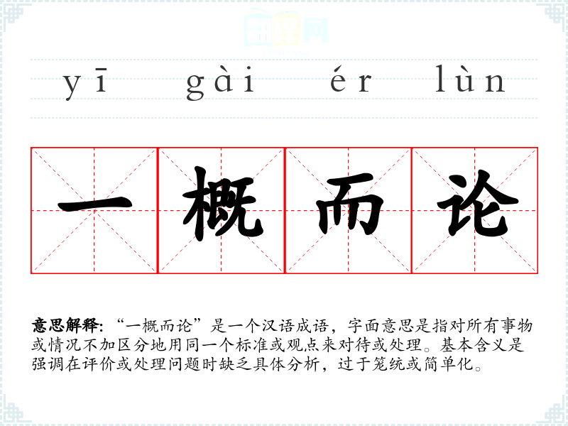 “一概而论”是一个汉语成语,字面意思是指对所有事物或情况不加区分地用同一个标准或观点来对待或处理。基本含义是强调在评价或处理问题时缺乏具体分析,过于笼统或简单化。