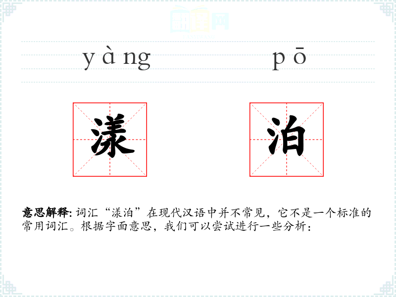 词汇“漾泊”在现代汉语中并不常见,它不是一个标准的常用词汇。根据字面意思,我们可以尝试进行一些分析: