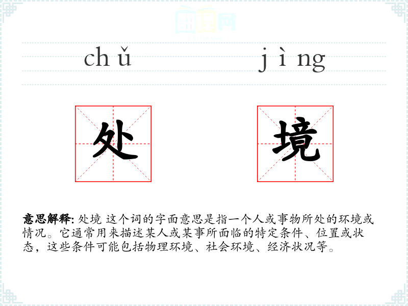 处境 这个词的字面意思是指一个人或事物所处的环境或情况。它通常用来描述某人或某事所面临的特定条件、位置或状态,这些条件可能包括物理环境、社会环境、经济状况等。
