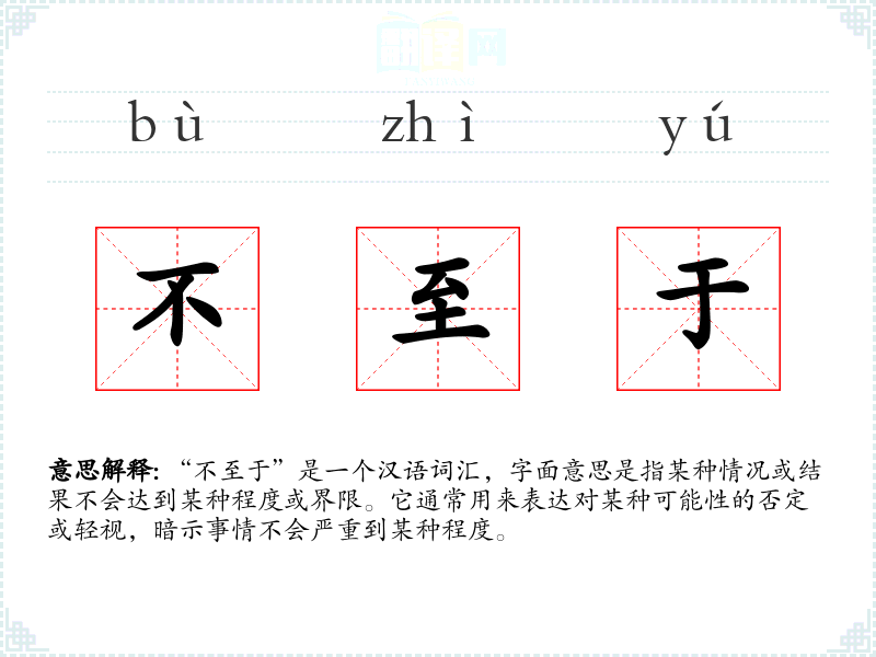 “不至于”是一个汉语词汇,字面意思是指某种情况或结果不会达到某种程度或界限。它通常用来表达对某种可能性的否定或轻视,暗示事情不会严重到某种程度。