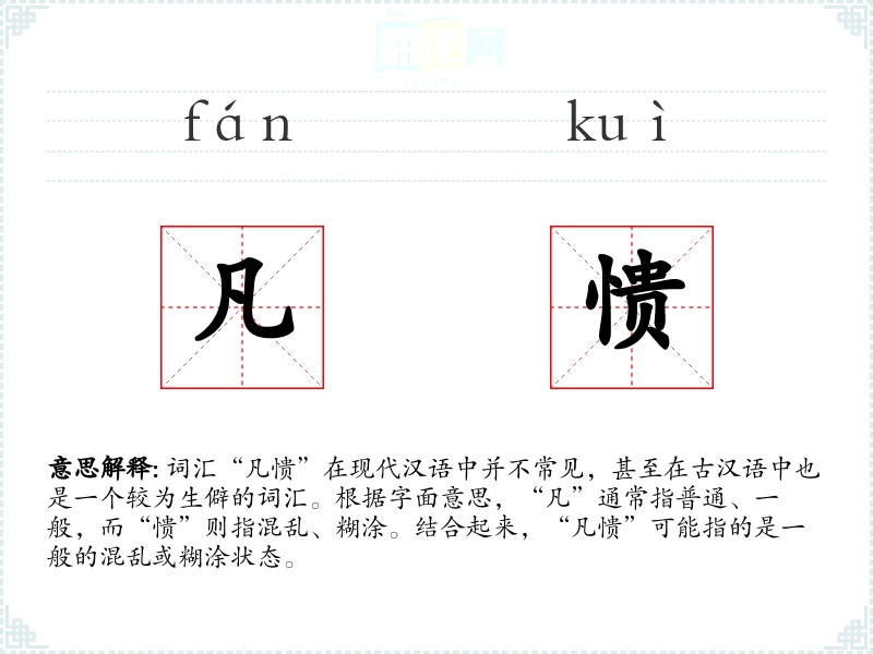 词汇“凡愦”在现代汉语中并不常见,甚至在古汉语中也是一个较为生僻的词汇。根据字面意思,“凡”通常指普通、一般,而“愦”则指混乱、糊涂。结合起来,“凡愦”可能指的是一般的混乱或糊涂状态。