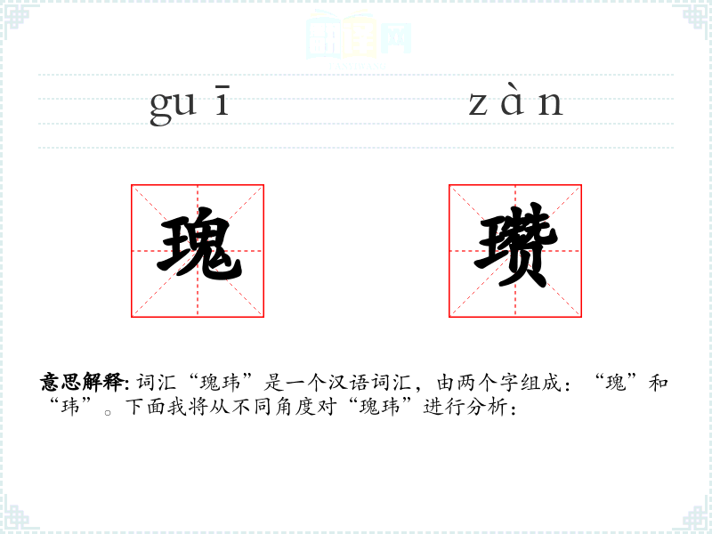 - 瑰:源自古代汉语,原指奇异的石头,后泛指珍奇之物。