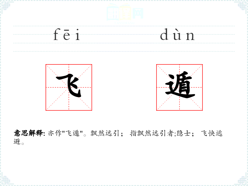 亦作"飞遁"。飘然远引; 指飘然远引者;隐士; 飞快逃避。