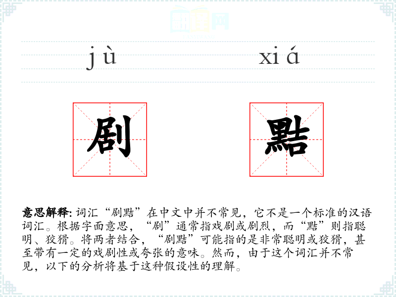 由于“剧黠”不是一个标准词汇,它的词源和演变难以追溯。可能是由“剧”和“黠”两个字组合而成的新词,用于特定的文学或戏剧语境中。