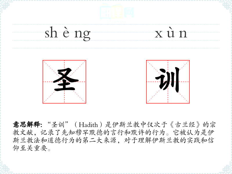 同义词:“哈迪斯”(Hadith的另一种音译) 反义词:由于“圣训”是一个特定的**术语,没有直接的反义词。