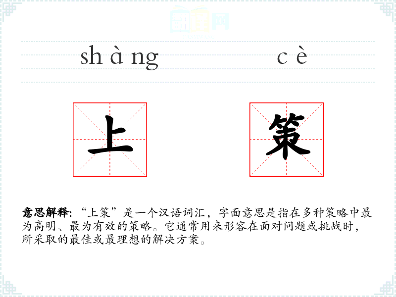 “上策”是一个汉语词汇,字面意思是指在多种策略中最为高明、最为有效的策略。它通常用来形容在面对问题或挑战时,所采取的最佳或最理想的解决方案。