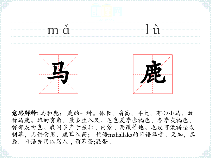 1.马和鹿; 鹿的一种。体长,肩高,耳大,有如小马,故称马鹿。雄的有角,最多生八叉。毛色夏季赤褐色,冬季灰褐色,臀部灰白色。我国多产于东北﹑内蒙﹑西藏等地。毛皮可做褥垫或制革,肉供食用,鹿茸入药; 梵语mahallaka的日语译音。无知,愚蠢。日语亦用以骂人﹐谓笨蛋;混蛋。