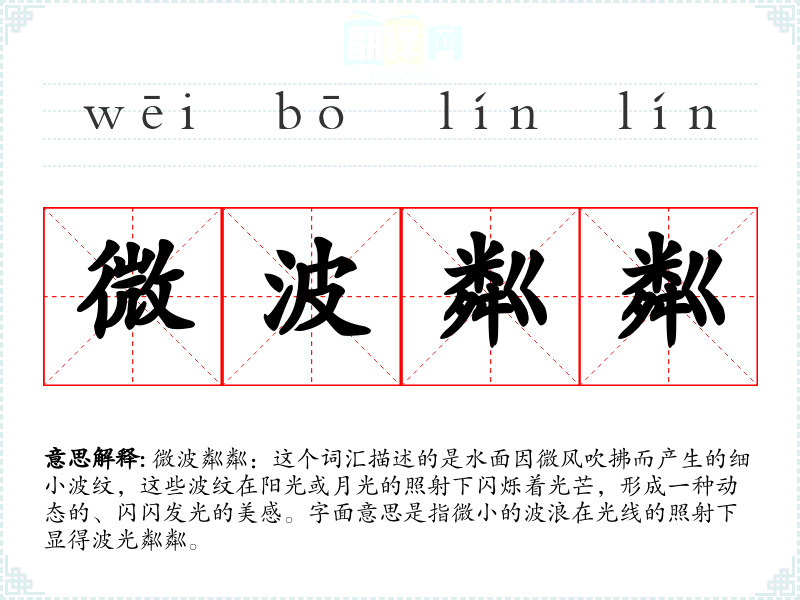 微波粼粼:这个词汇描述的是水面因微风吹拂而产生的细小波纹,这些波纹在阳光或月光的照射下闪烁着光芒,形成一种动态的、闪闪发光的美感。字面意思是指微小的波浪在光线的照射下显得波光粼粼。