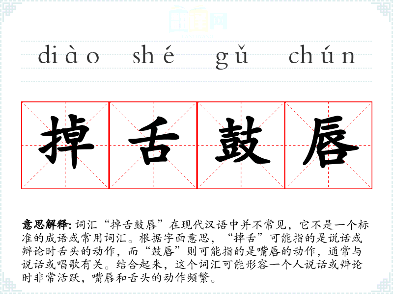 词汇“掉舌鼓唇”在现代汉语中并不常见,它不是一个标准的成语或常用词汇。根据字面意思,“掉舌”可能指的是说话或辩论时舌头的动作,而“鼓唇”则可能指的是嘴唇的动作,通常与说话或唱歌有关。结合起来,这个词汇可能形容一个人说话或辩论时非常活跃,嘴唇和舌头的动作频繁。