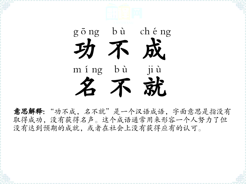 “功不成,名不就”是一个汉语成语,字面意思是指没有取得成功,没有获得名声。这个成语通常用来形容一个人努力了但没有达到预期的成就,或者在社会上没有获得应有的认可。