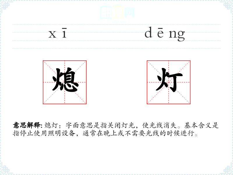 熄灯:字面意思是指关闭灯光,使光线消失。基本含义是指停止使用照明设备,通常在晚上或不需要光线的时候进行。
