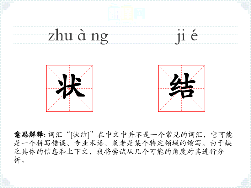 词汇“[状结]”在中文中并不是一个常见的词汇,它可能是一个拼写错误、专业术语、或者是某个特定领域的缩写。由于缺乏具体的信息和上下文,我将尝试从几个可能的角度对其进行分析。