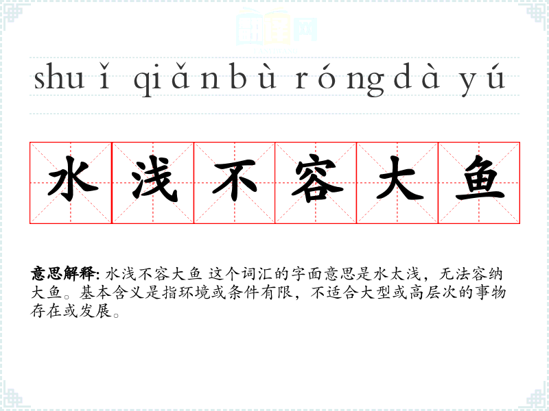 水浅不容大鱼 这个词汇的字面意思是水太浅,无法容纳大鱼。基本含义是指环境或条件有限,不适合大型或高层次的事物存在或发展。