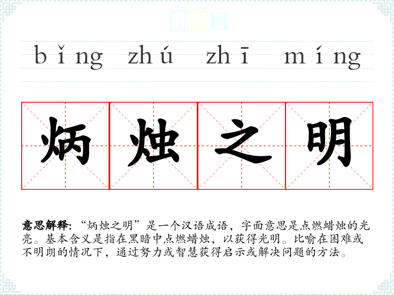 “炳烛之明”出自《左传·宣公十五年》:“炳烛之明,孰与昧行乎?”原意是指在黑暗中点燃蜡烛,以获得光明。随着时间的推移,这个成语的含义扩展到比喻在困难中寻找解决办法。