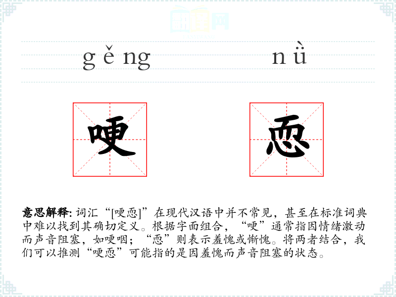 词汇“[哽恧]”在现代汉语中并不常见,甚至在标准词典中难以找到其确切定义。根据字面组合,“哽”通常指因情绪激动而声音阻塞,如哽咽;“恧”则表示羞愧或惭愧。将两者结合,我们可以推测“哽恧”可能指的是因羞愧而声音阻塞的状态。